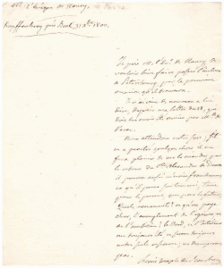 ►Intéressante lettre du Prince de Condé en 1800, au moment où l’on envisageait de licencier son armée ; la missive est à l’adresse de Mgr de La Farre, représentant Louis XVIII à Vienne, un des principaux agents de la cause royaliste.
