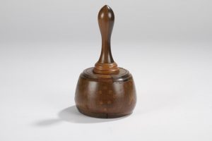 « Maul » ou maillet maçonnique. Il est composé de différents bois de couleurs. Il est orné sur la face bombée du compas équerre. Début du XXe siècle. H. : 18,5 cm