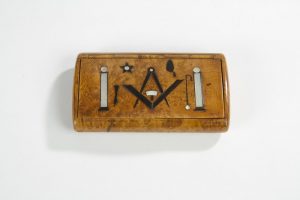 Tabatière en loupe. Le couvercle est orné d’incrustations en corne et en nacre : Compas-équerre, maillet, colonnes, perpendiculaire, maillet, étoile. XIXe siècle. 10 x 5,5 cm