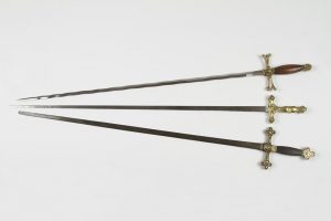 Glaive maçonnique, poignée terminée par des trèfles gravés de la truelle, maillet, compas-équerre et delta rayonnant ainsi que l’inscription « G :. Or : Lusitano » Portugal. Lame acier signée. XIXe siècle.