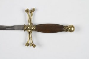Glaive flamboyant. Poignée en noyer terminée par un crâne et quillons en bronze ciselé. Lame signée « Coulaud à Klingenthal ». XIXe siècle.