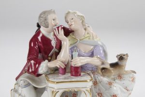 Figurine en porcelaine de Meissen représentant un couple assis autour d’un guéridon. La femme a un carlin sur ses genoux et offre un verre à son compagnon qui est revêtu de son tablier franc-maçon et de son cordon de Vénérable. Manufacture...