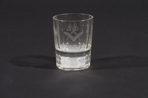 Verre à whisky gravé des symboles maçonniques : compas-équerre, delta, soleil et lune. Il est doté d’un double fond contenant trois dés en porcelaine. XIXe siècle. H. : 7,5 cm C.F. Musée maçonnique de Londres.