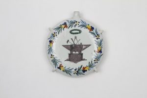 Gourde en faïence peinte. Elle est ornée sur une face du compas-équerre, maillet et enclume. L’autre face porte l’inscription « Alexandre Bouchet fils et Ainé le 16 8bre 1847 ». XIXe siècle. 15,5 cm Cheveu