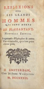 [BOUREAU-DESLANDES (André François)]. Reflexions sur les Grands Hommes qui sont morts en Plaisantant. Nouvelle Édition. Augmentée d’Epitaphes & autres Pieces curieuses, qui n’ont point encore paru. Amsterdam, chez les frères Westeing, 1732.