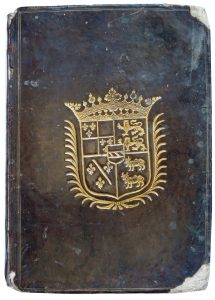 In-4, reliure de l’époque veau glacé brun, dos lisse, grandes armoiries (famille d’Albret, vaches clarinées du Béarn et lions léopardés) frappées au centre des plats encadrées d’un double filet doré. Mors en grande partie fendus, coiffes arasées, deux petites galeries de vers sur le second plat, coins très usés avec manques de cuir dans les angles. (10)-915 pp.