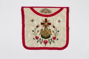 Tablier de Chevalier Rose-Croix en soie, cannetilles et broderies de coton. XIXe siècle. 36 x 32 cm