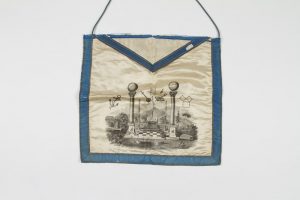 Tablier de Maître en soie à décor imprimé représentant en partie basse le cercueil d’Hiram, outils, les deux colonnes, pavé mosaïque, chandeliers, bible, etc.. XIXe siècle. 42 x 39 cm