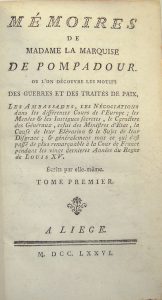 POMPADOUR (Marquise de) Mémoires de Madame la Marquise de Pompadour où l’on découvre les motifs des guerres et des traités de paix, les Ambassades, les négociations dans les différentes Cours de l’Europe… Liège, s. n., 1776.