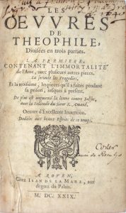 VIAU (Théophile de) Les OEuvres de Theophile. Divisées en trois parties. La premiere, contenant l’immortalité de l’Ame, avec plusieurs autres pieces. La seconde les Tragedies. Et la troisième, les pieces qu’il a faites pendant sa prison,...