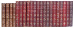 17 volumes in-18, reliure demi-chagrin rouge, dos à 5 nerfs mosaïqué à décor de fleurs, tête dorée. Qq. frottements sur les coiffes et nerfs, dos parfois un peu sombres. Rousseurs inégalement réparties et plutôt diffuses, papier un peu jauni.