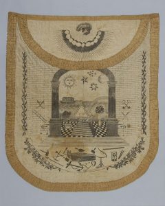 Tablier de Maître en soie à décor imprimé représentant l’entrée du Temple, pavé mosaïque, arche d’alliance, ruche, delta, soleil-lune, arche de Noé, étoiles, arc en ciel. En partie basse, d’autres symboles dont le cercueil d’Hiram....