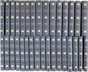 32 volumes in-4, reliure demi-chagrin bleu nuit, dos à 4 nerfs orné, tête dorée. Couvertures conservées.