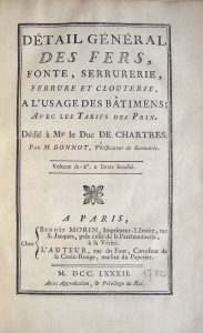 BONNOT (Vérificateur de Serrurerie). Détail Général des Fers, Fonte, Serrurerie, Ferrure et Clouterie, à l’usage des bâtimens ; Avec les tarifs des prix. Dédié à Mgr le Duc de Chartres. Paris, Morin, 1782.