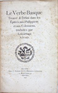 [BASQUE]. DODGSON (Edward Spencer). Le Verbe Basque trouvé et défini dans les Epîtres aux Philippiens et aux Colossiens, traduites par Leiçarraga A. D. [Anno Domini] 1571. Oxford, Parker, imprimé à Vilanova, Oliva y Mila, Mars 1902.