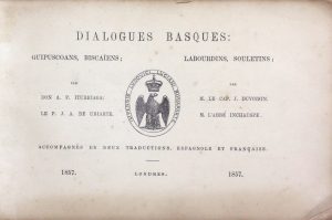 [BASQUE]. ITUGARRAGA (A. P.), URIARTE (J. A. de), DUVOISIN (J.), INCHAUSPE (Abbé) Dialogues Basques, Guipuscoans, Biscaïens ; Labourdins, Souletins. Accompagnés de deux traductions, espagnole et française. Londres, s. n. 1857.