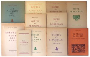 • Poètes du Bordelais. 1900-1956. Ed. d’Aquitaine, 1955-56. 2 volumes. Poètes du Périgord. 1900-1956. Ed. d’Aquitaine, 1956. Poètes des Landes. 1900-1958. Ed. d’Aquitaine, 1958. Poètes de l’Agenais. 1900-1959. Ed. d’Aquitaine, 1959. Poètes de la Bigorre et du Comminges. id. 1963. 1/500 ex. num.
