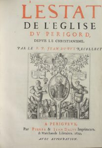 DUPUY (Jean) AUDIERNE (Abbé). L’Estat de l’Eglise du Périgord par le R. P. Dupuy, Récolet, annoté par l’Abbé Audierne et reproduit, d’après l’édition primitive, par le procédé litho-typographique. Périgueux, Baylé, 1842.