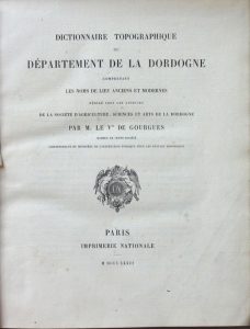 GOURGUES (Vicomte de). Dictionnaire Topographique du Département de la Dordogne comprenant les noms de lieu anciens et modernes… Paris, Imprimerie Nationale, 1873.