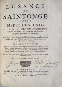 BECHET (Cosme). L’Usance de Saintonge entre Mer et Charente, Colligée des anciens Manuscrits, illustrée de Notes, & confirmée par quantité d’enquêtes par turbes & notorietez. Avec deux Traités des Secondes Nôces, & du droit de Reversion,...