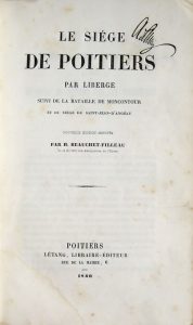 LIBERGE (A.). Le Siège de Poitiers suivi de la Bataille de Moncontour et du siège de Saint-Jean-d’Angély.  Nouvelle édition annotée par H. Beauchet-Filleau. Poitiers, Létang, 1846.