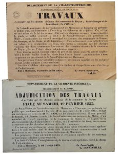 Placard (31 x 43 cm). Le Commissaire de l’Arrondissement (Salis) prévient le Public de l’adjudication des travaux à exécuter sur les chemins vicinaux des communes de Royan, St Georges et de Saint-Denis (ile d’OLÉRON).