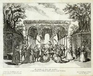 Celle-ci aurait été « exécutée, selon Sieurin, pour une édition in-4 qui n'a jamais été imprimée et utilisée par la suite, après l'encadrement supprimé et la lettre ajoutée » (Cohen). Les cinq estampes repliées portent, en plus des légendes, la mention : Se vend chez Leblanc fils à St Etienne en Forêt à la Salle de Comédie.