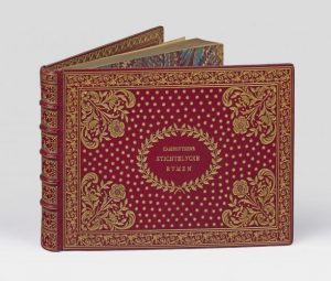 centre contenant le titre et l'adresse, dos orné, roulette sur les coupes, dentelle intérieure dorée, tranches dorées (Ch. de Samblanx, 1912).
