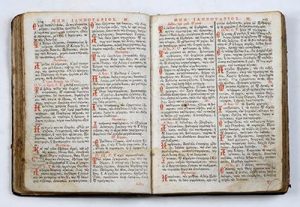 ►Rare édition vénitienne du menaion de janvier, soigneusement imprimée en grec, en rouge et noir, et ornée d'un encadrement de titre et d'une figure à pleine page gravés sur bois.