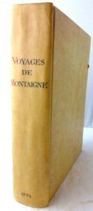 MONTAIGNE (Michel de). Journal du voyage en Italie, par la Suisse & l'Allemagne, en 1580 & 1581. Avec des notes par M. de Querlon. Rome ; Paris, Le Jay, 1774. In-4, bradel vélin ivoire à recouvrements, dos lisse avec le titre calligraphié en...
