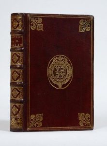 In-8, maroquin rouge, triple filet doré, fleurs de lis aux angles, armoiries au centre, dos orné, fer à la fleur de lis et au dauphin couronnés en queue, roulette sur les coupes, roulette intérieure dorée, tranches dorées (Reliure de l’époque).