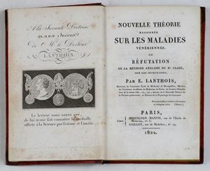 LANTHOIS (Étienne). Nouvelle théorie raisonnée sur les maladies vénériennes, ou réfutation de la méthode anglaise du Dr Clare sur les injections. Paris, Méquignon-Marvis, Gaillot, 1822. In-8, demi-basane maroquinée rouge avec coins, dos...