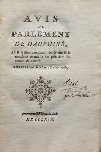 [BIGOT DE SAINTE CROIX (Louis Claude)]. Avis du Parlement de Dauphiné, sur la libre circulation des Grains & la réduction naturelle des prix dans les années de cherté. [Grenoble], 1769. In-8, broché, couverture de papier marbré de l'époque.