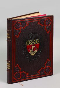 In-4, [8] f., 81 p., [2] f., illustr. en noir dans le texte et h.-t., maroquin brun, dos à 4 nerfs, auteur et titre dorés, armes de la ville de Paris encadré d’une bordure au plat supérieur, le tout mosaïqué, double filet doré aux coupes, doubles gardes, bords des contreplats décorés, tête dorée [École Estienne].