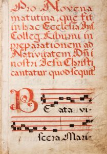 Testo in rosso e nero con note musicali pentagrammate e 12 capilettera rossi. Legatura in pelle marocchina con filetti e decorazioni in oro ai piatti e al dorso.