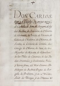 Manoscritto a inchiostro nero con intestazione "Don Carlos por la gracia de Dios [...]".