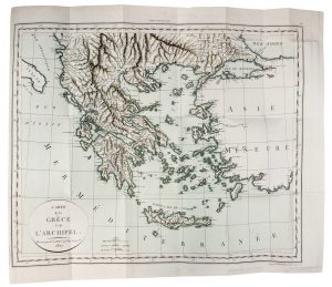 Edizione originale della traduzione dal tedesco ad opera di August Du Coudray, delle lettere del viaggiatore e diplomatico prussiano Bartholdy, che illustra il modo di viaggiare in Grecia e nelle isole dell'arcipelago, impreziosita da 16 belle tavole incise in rame da disegni di Georg Christian Gropius, artista che accompagnò l'Autore nel suo itinerario, di cui 10 di costumi e scene di genere in acquarellatura coeva e 1 grande mappa con i contorni colorati. Atabey 74 : Blackmer 87.