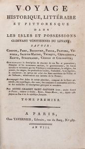 GRASSET de SAINT-SAUVEUR ANDRÉ, Voyage historique, litteraire et pittoresque dans les isles et possessions ci-devant venitiennes du Levant : savoir : Corfou, Paxo, Bucintro, Parga, Prevesa, Vonizza, Sainte-Maure, Thiaqui, Cephalonie, Zante... Tome...