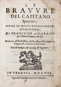 ANDREINI FRANCESCO, Le bravure del Capitano Spavento : divise in molti ragionamenti in forma di dialogo... In Venetia : appresso Giacomo Antonio Somasco, 1607.
