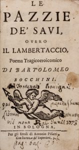 BOCCHINI BARTOLOMEO, Le pazzie de' savi, overo il Lambertaccio, Poema tragicoeroicomico. In Bologna : Presso gli Eredi di Antonio Pisarri, s.d. [ma post 1690].