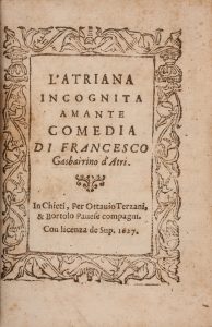 GASBARRINO FRANCESCO, L'Atriana incognita amante. Comedia. In Chieti : per Ottavio Terzani e Bortolo Pavese compagni, 1627.