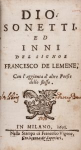 LEMENE FRANCESCO (de), Dio, sonetti, ed inni [...] : con l'aggiunta d'altre poesie dello stesso. In Milano : nella stamperia di Francesco Vigone, 1693.
