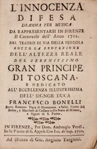 SILVANI FRANCESCO, L'innocenza difesa dramma per musica da rappresentarsi in Firenze il Carnovale dell'anno 1721. Nel teatro di via della Pergola... In Firenze : per Dom. Ambrogio Verdi ad istanza di Gio. Angiolo Targioni, 1720.