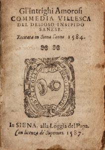 TREGIANI DOMENICO, Gl'intrighi amorosi. Commedia villesca del Desioso Insipido sanese. Recitata in Siena l'anno 1584. In Siena : alla Loggia del Papa [Luca Bonetti], 1587.