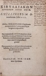 SIBYLLIAKON CHRESMON LOGOI OKTO. Sibyllinorum oraculorum libri VIII. Addita Sebastiani Castalionis interpretatione Latina, quae Graeco eregione respondeat. Cum annotationib. Xysti Betuleij... Basileae : per Ioannem Oporinum (Al colophon : ) 1555.