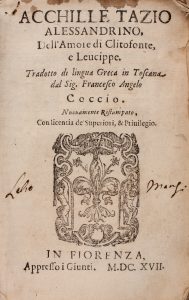 •Id., Dell'amore di Leucippe et di Clitophonte. In Fiorenza : appresso i Giunti, 1617. In-8° (mm 150x105). Carte [2], 110. Gora d'acqua marginale al frontespizio. Sporadiche arrossature e fioriture. Qualche macchia più evidente alle carte centrali dell'opera.