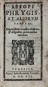 AESOPUS, AESOPI PHRYGIS, et ALIORUM FABULAE . Venetijs : apud Sebastianum Combi, 1607.