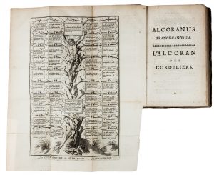 Prima edizione illustrata da Picard di questa celebre parodia del De conformitate vitae Beati Francisci ad vitam domini Jesu di Bartolomeo da Rinonico noto anche come Bartolomeo da Pisa, divenuta oggetto degli attacchi dei luterani e dei giansenisti.