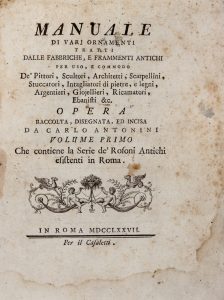 ANTONINI CARLO, Manuale di varj ornamenti tratti dalle fabbriche, e frammenti antichi per uso, e commodo de' scultori, pittori, architetti, scarpellini [...]. Volume primo (-quarto). Roma : per il Casaletti dalle stampe del Barbiellini alla...