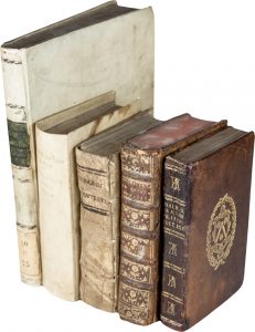 Legatura settecentesca in pergamena di riuso con titoli un tempo dorati su tassello al dorso.